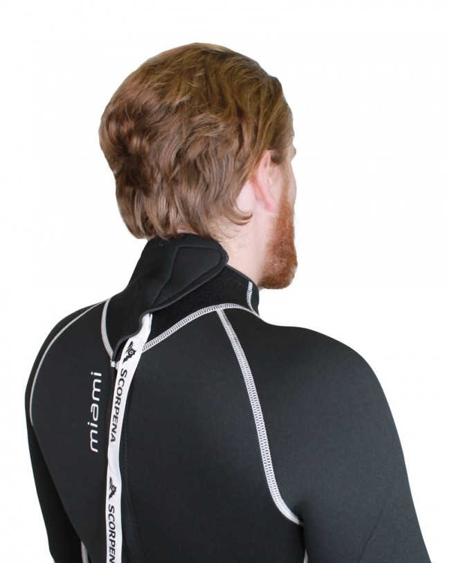 Hidrotērpa apkaklē ir izmantots īpašs neoprēns, kas nodrošina labāko saskari ar ķermeni.